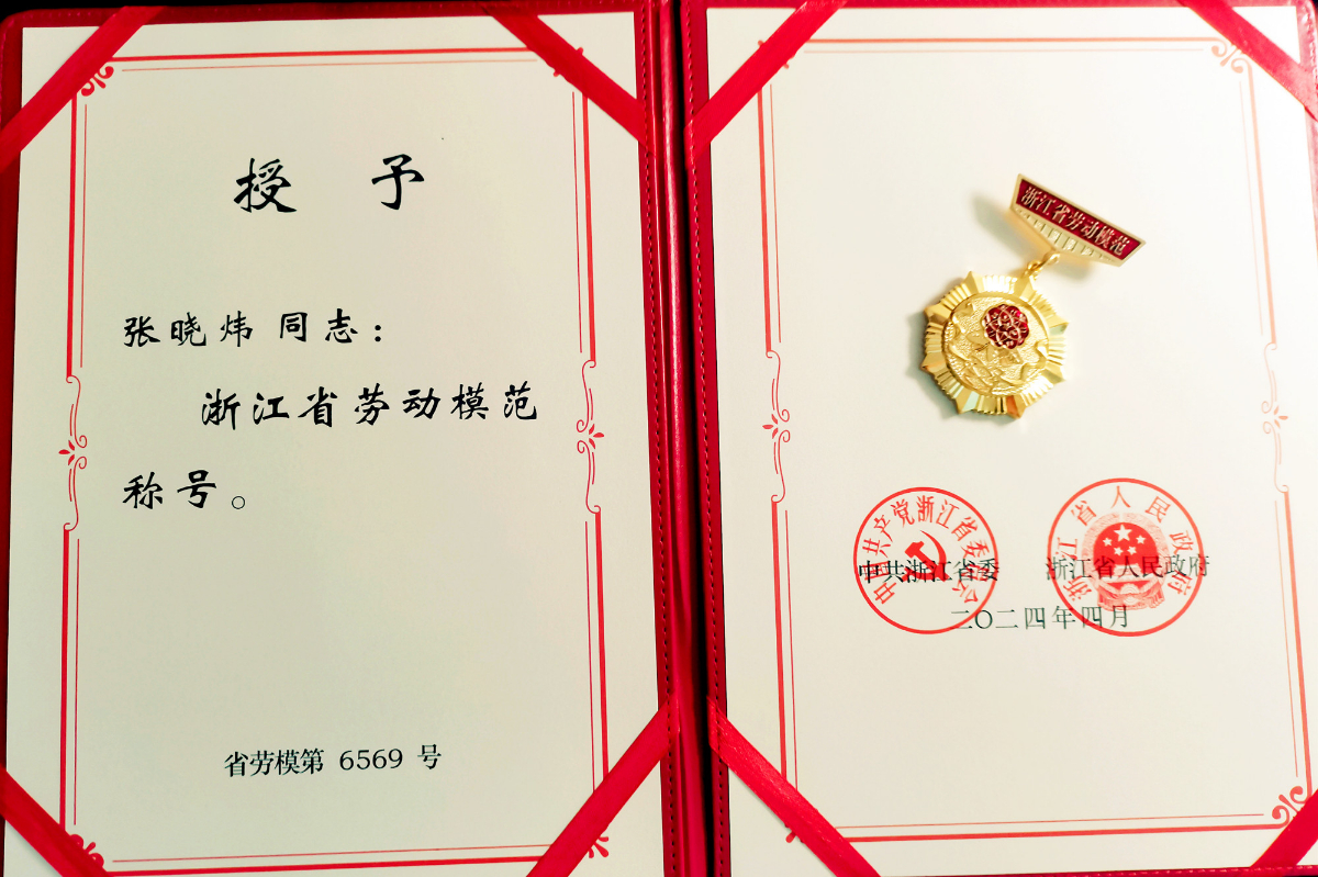 张晓炜荣获“2024年浙江省劳动模范”证书与勋章。 王洋 提供