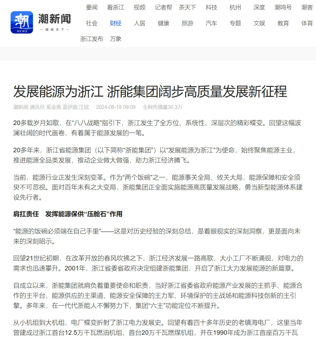 6月18日,“潮新闻”客户端报道《发展能源为浙江 188bet金宝博 阔步高质量发展新征程》。