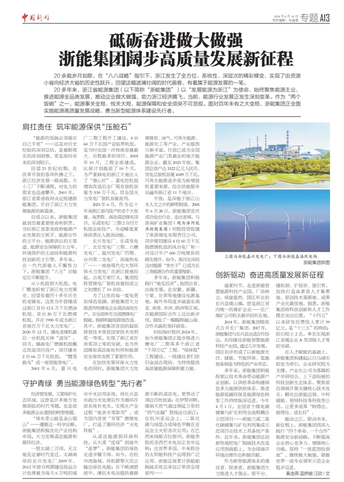 编者按:6月18日,在188bet金宝博 2024年“励企日”之际,中新社、新华社、潮新闻等媒体刊发专稿报道,回首20多年来广大188bet金宝博 人挺膺担当,奋力推动浙江能源做大做强的铿锵足迹。