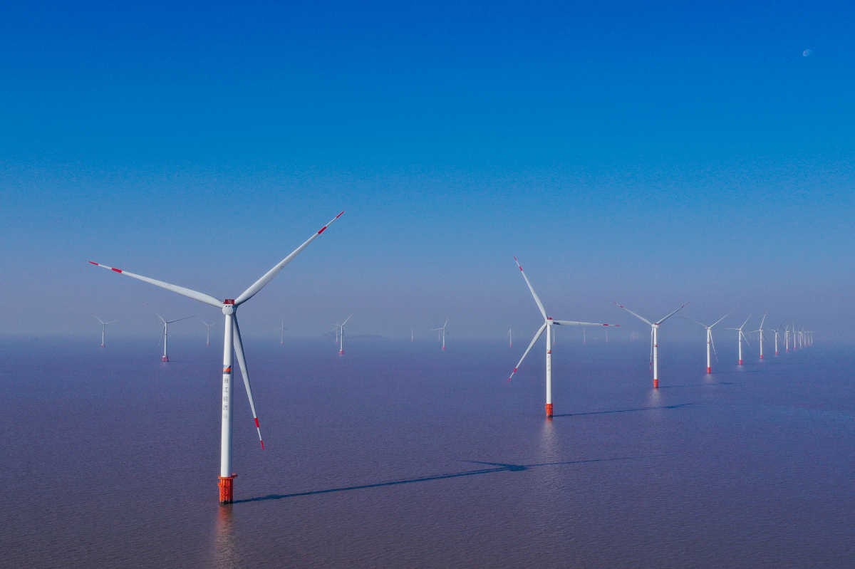 在杭州湾海域,风机群擎天而立输出绿色电能,图为188bet金宝博 嘉海风电场。 张露 提供