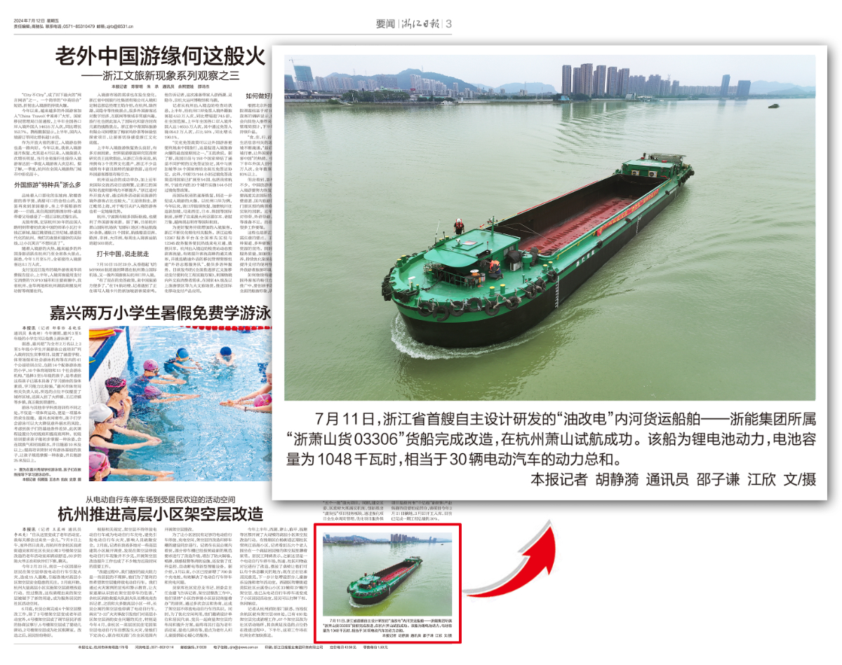 7月12日,《浙江日报》报道:浙江省首艘自主设计研发的“油改电”内河货运船舶——188bet金宝博 所属“浙萧山货03306”货船完成改造,在杭州萧山试航成功。 浙江日报 图