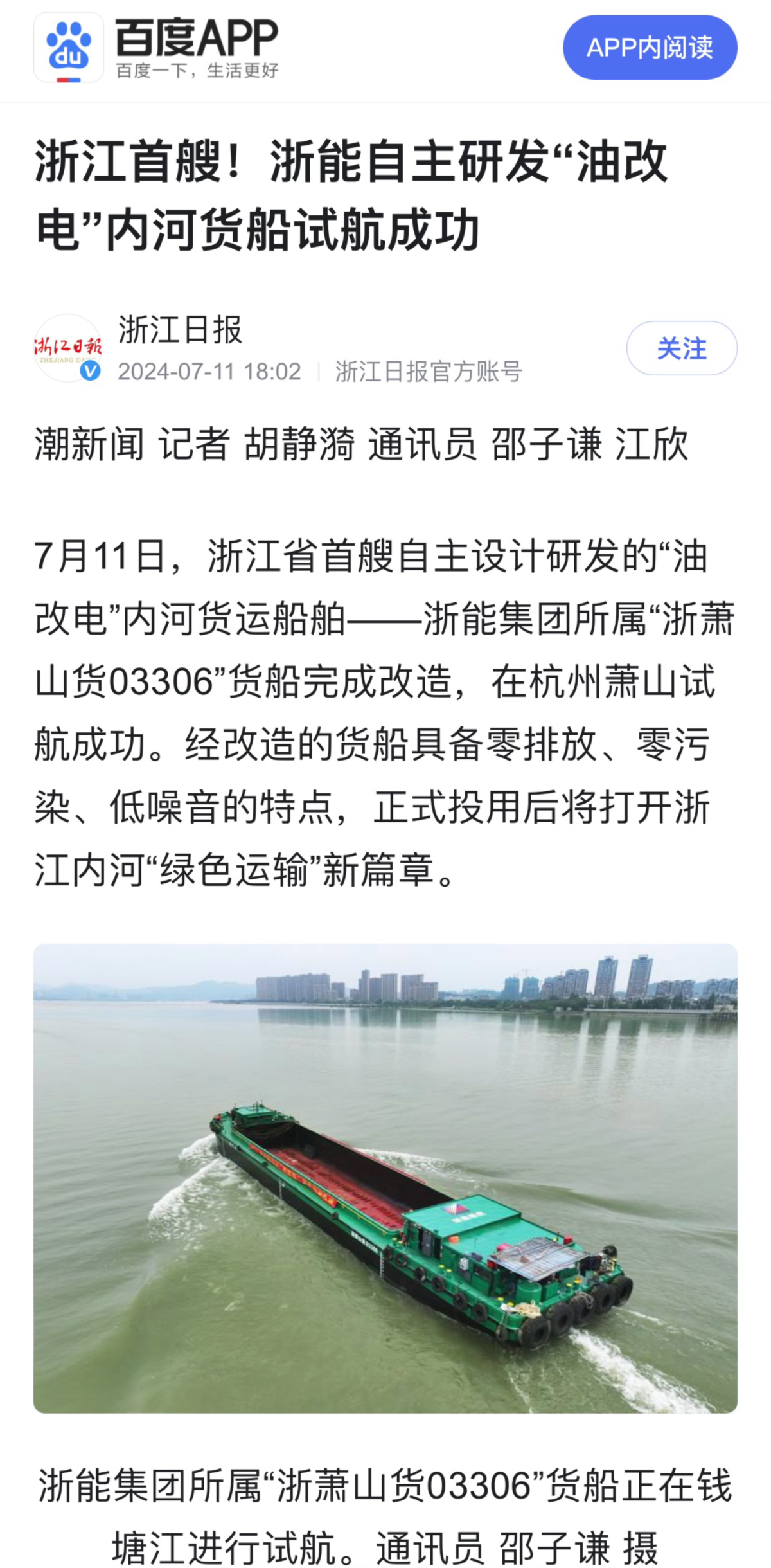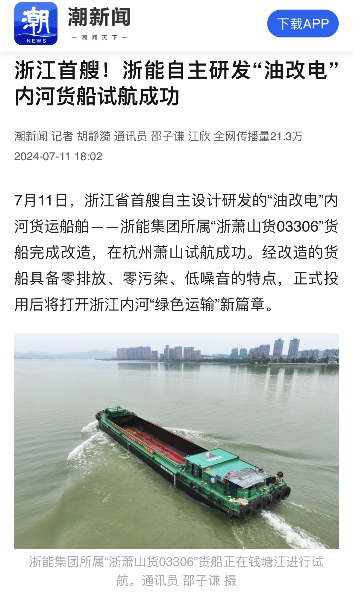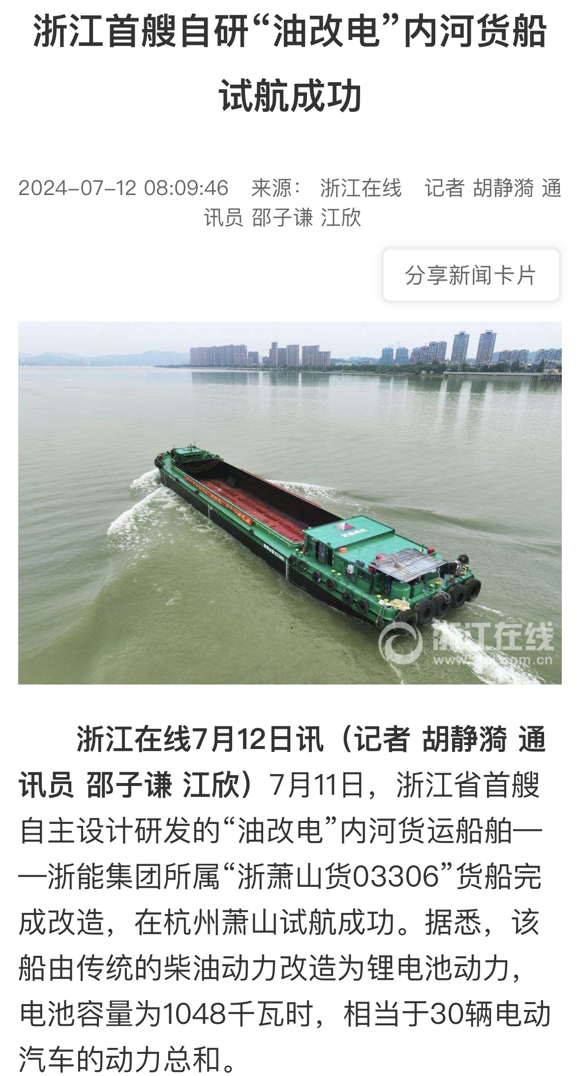 7月11日,潮新闻客户端报道《浙江首艘!188bet金宝博 自主研发“油改电”内河货船试航成功》。 潮新闻客户端 图