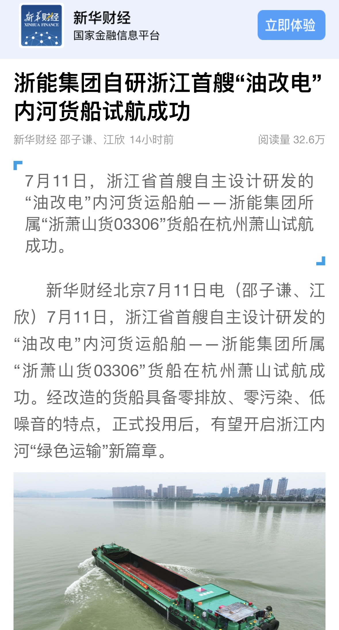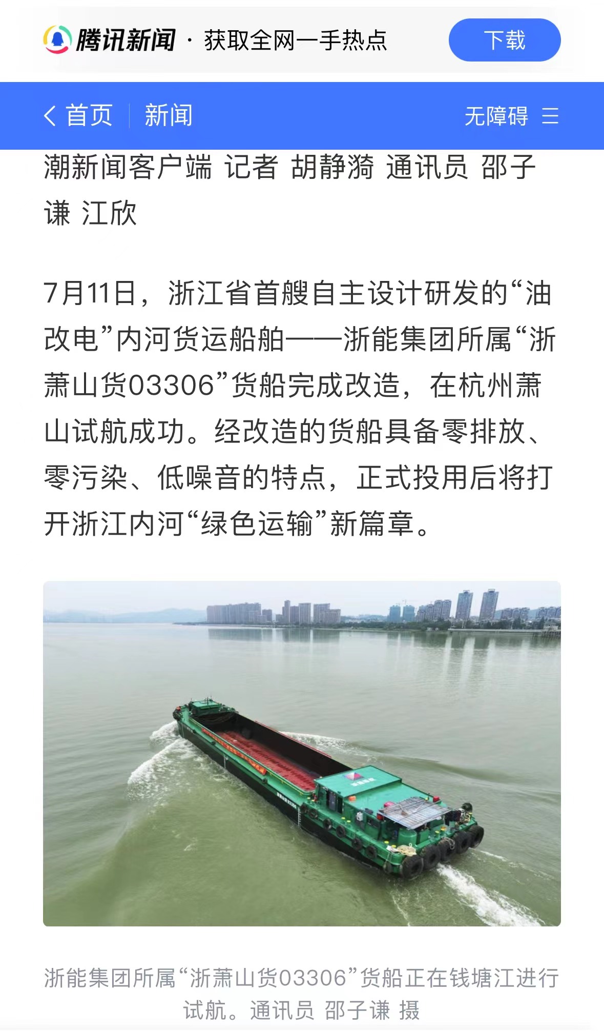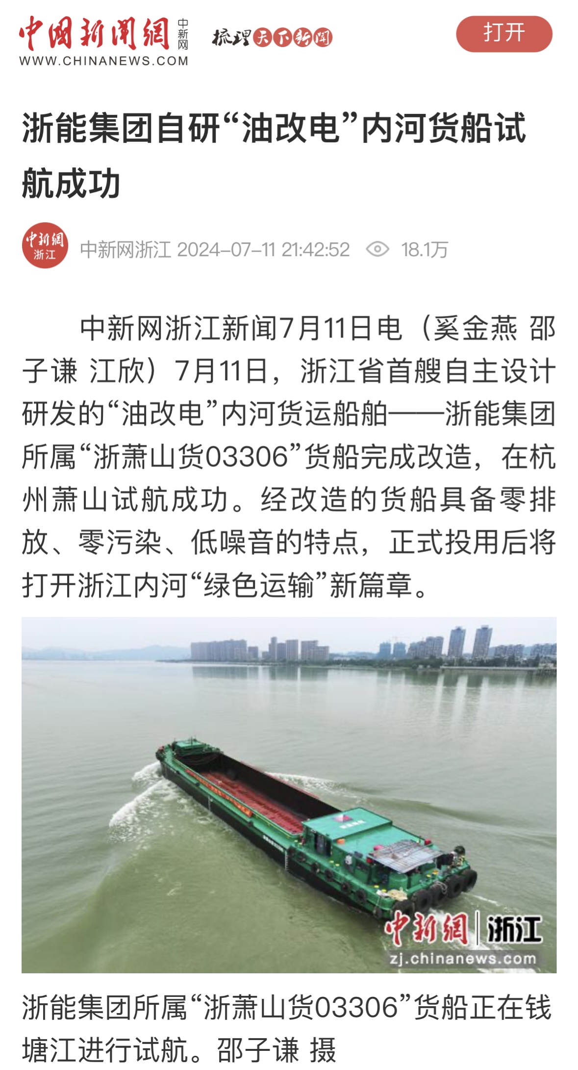 7月11日,潮新闻客户端报道《浙江首艘!188bet金宝博 自主研发“油改电”内河货船试航成功》。 潮新闻客户端 图