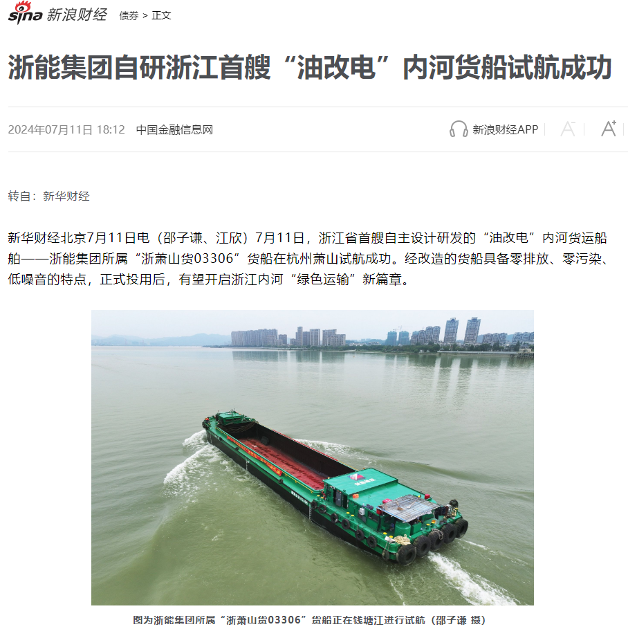 7月12日,新浪财经转载报道《188bet金宝博 自研“油改电”内河货船试航成功》。 新浪财经 图