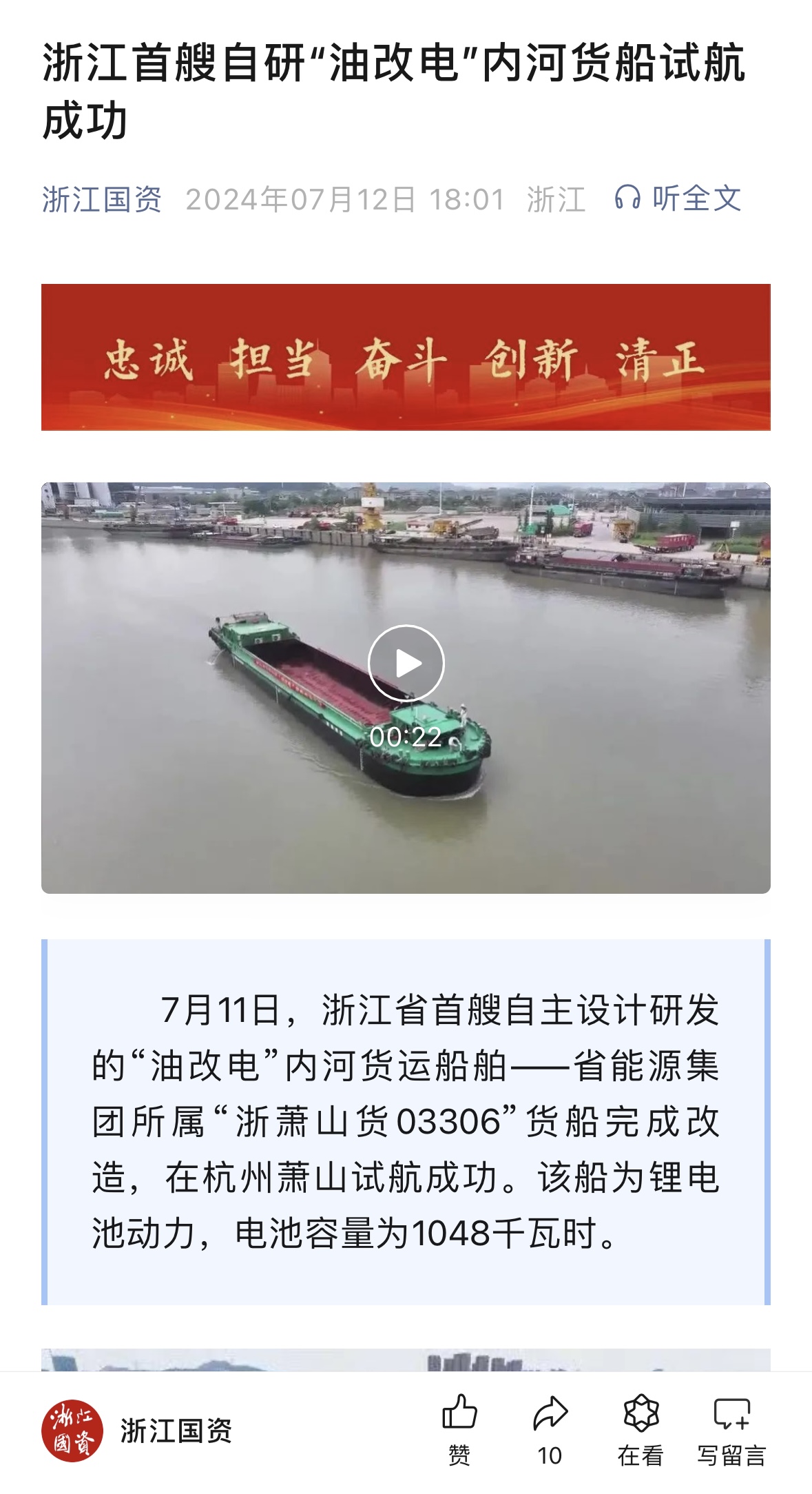 7月12日,浙江在线公众号报道《188bet金宝博 自研“油改电”内河货船试航成功》。 浙江在线 图