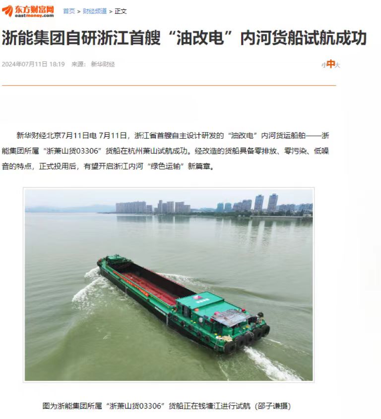 7月12日,浙江国资公众号报道《188bet金宝博 自研“油改电”内河货船试航成功》。 浙江国资 图