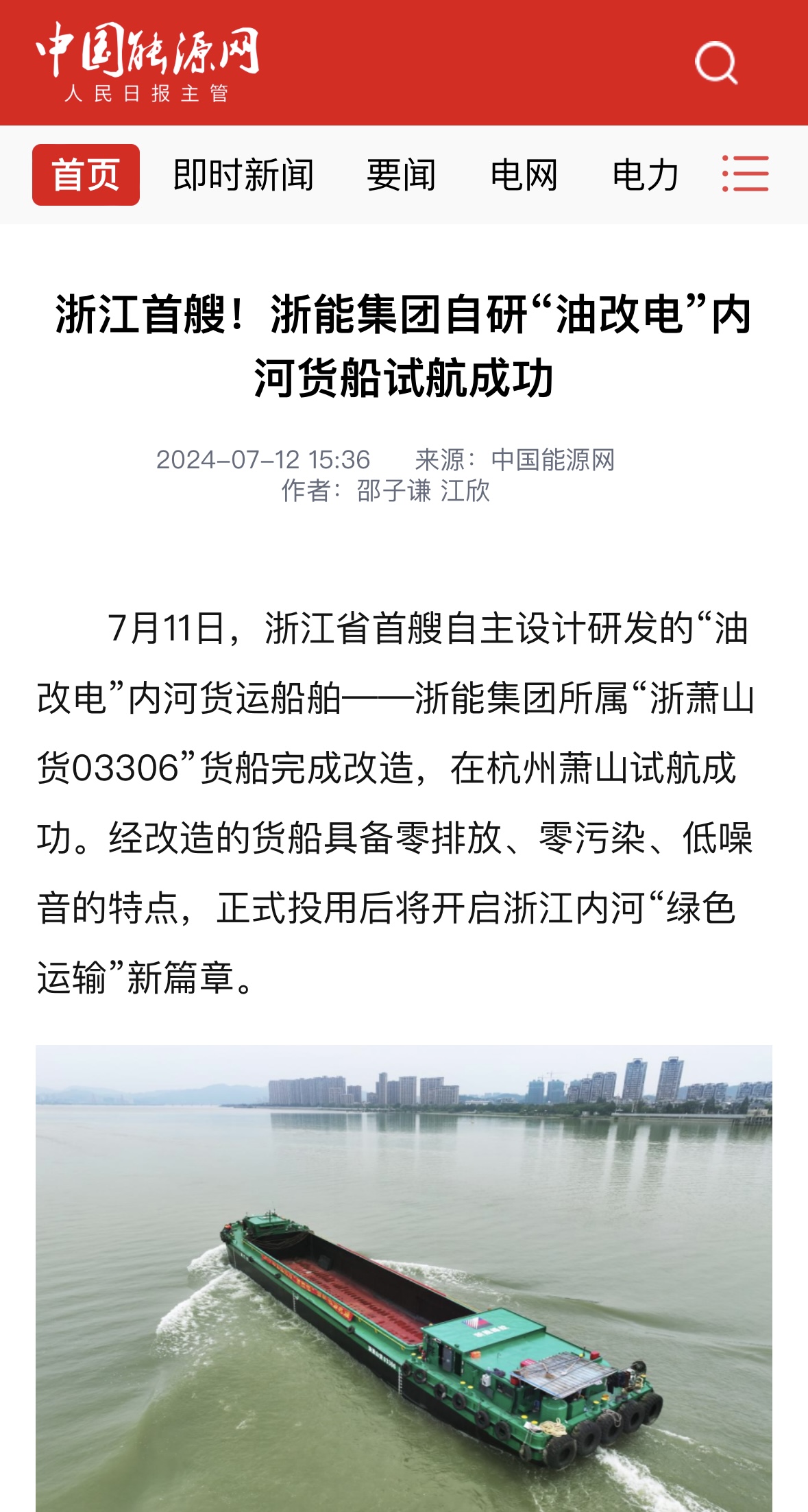 7月12日,中国能源网报道《188bet金宝博 自研“油改电”内河货船试航成功》。 中国能源网 图
