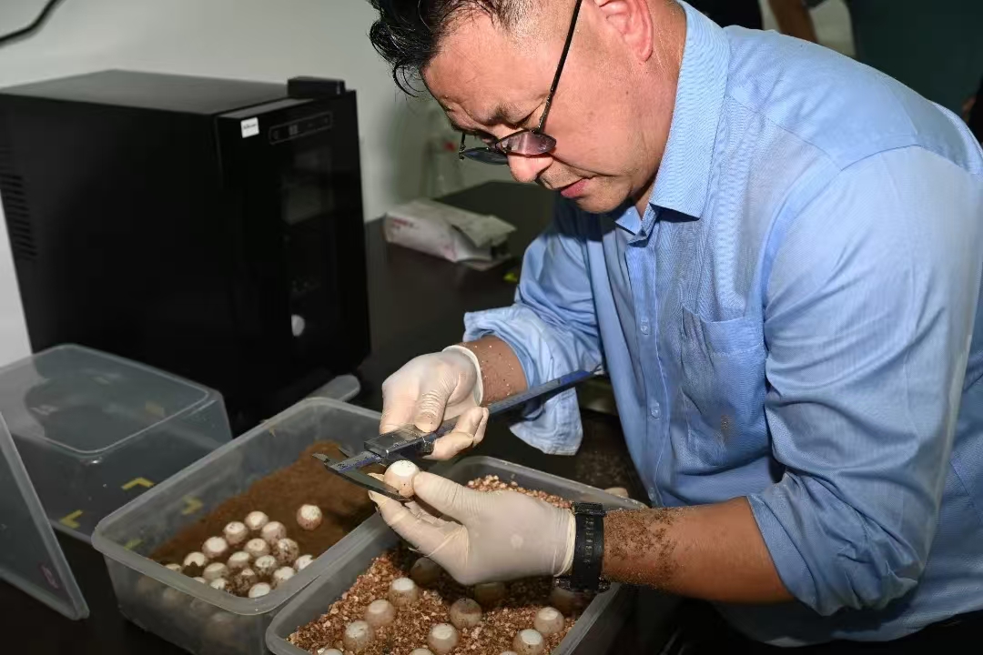 “鼋卵的外壳比较薄,如果能看到大面积的白色,说明这枚卵是受精成功的。”挑出受精的鼋卵后,叶承义将它们整齐地放置在铺满厚厚一层蛭石的塑料盒中,再盖上薄薄一层蛭石,盖好盖子,做好标记,放进恒温恒湿培养箱。“蛭石的作用主要是保温和保湿,大约58天到63天就能孵化出鼋苗。”