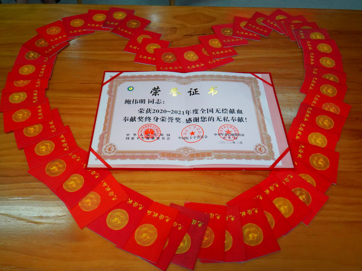 鲍伟明获得的无偿献血证及无偿献血奉献终身荣誉奖证书。 何云玲 摄