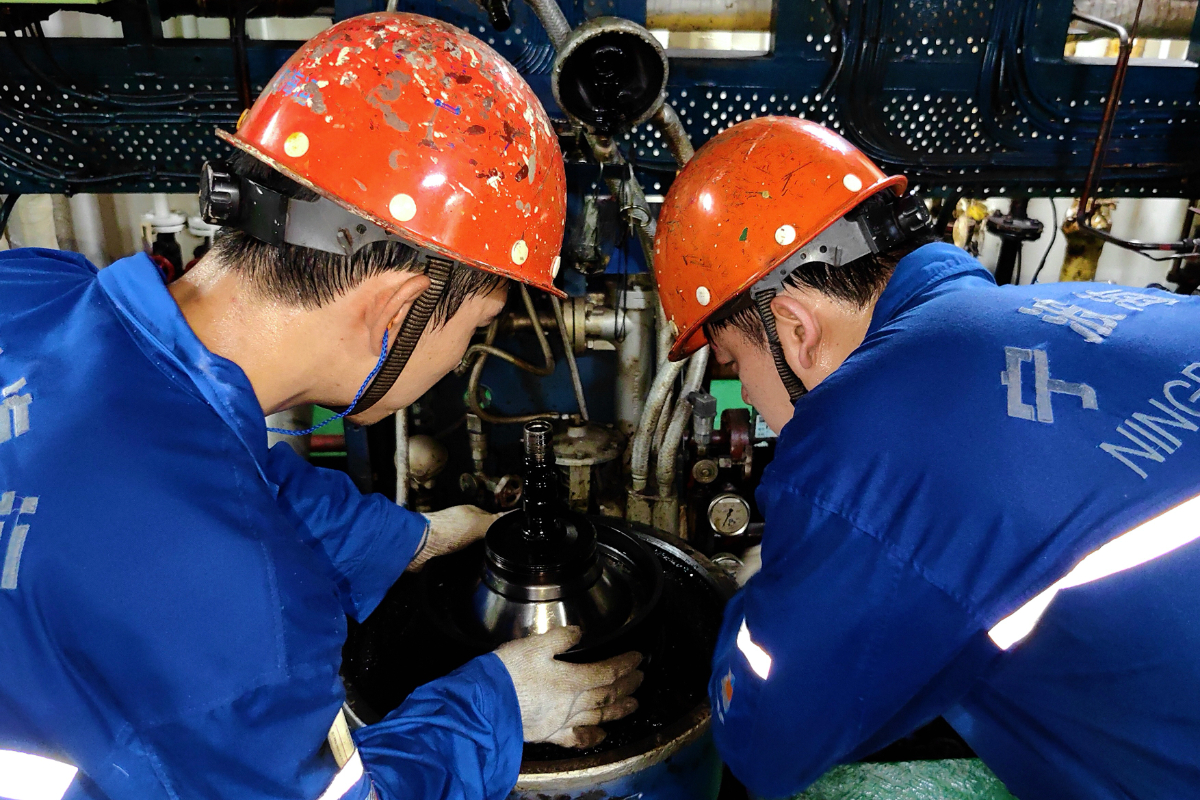 宁波海运船员在闷热的机舱内开展设备保养。 李靖南 摄