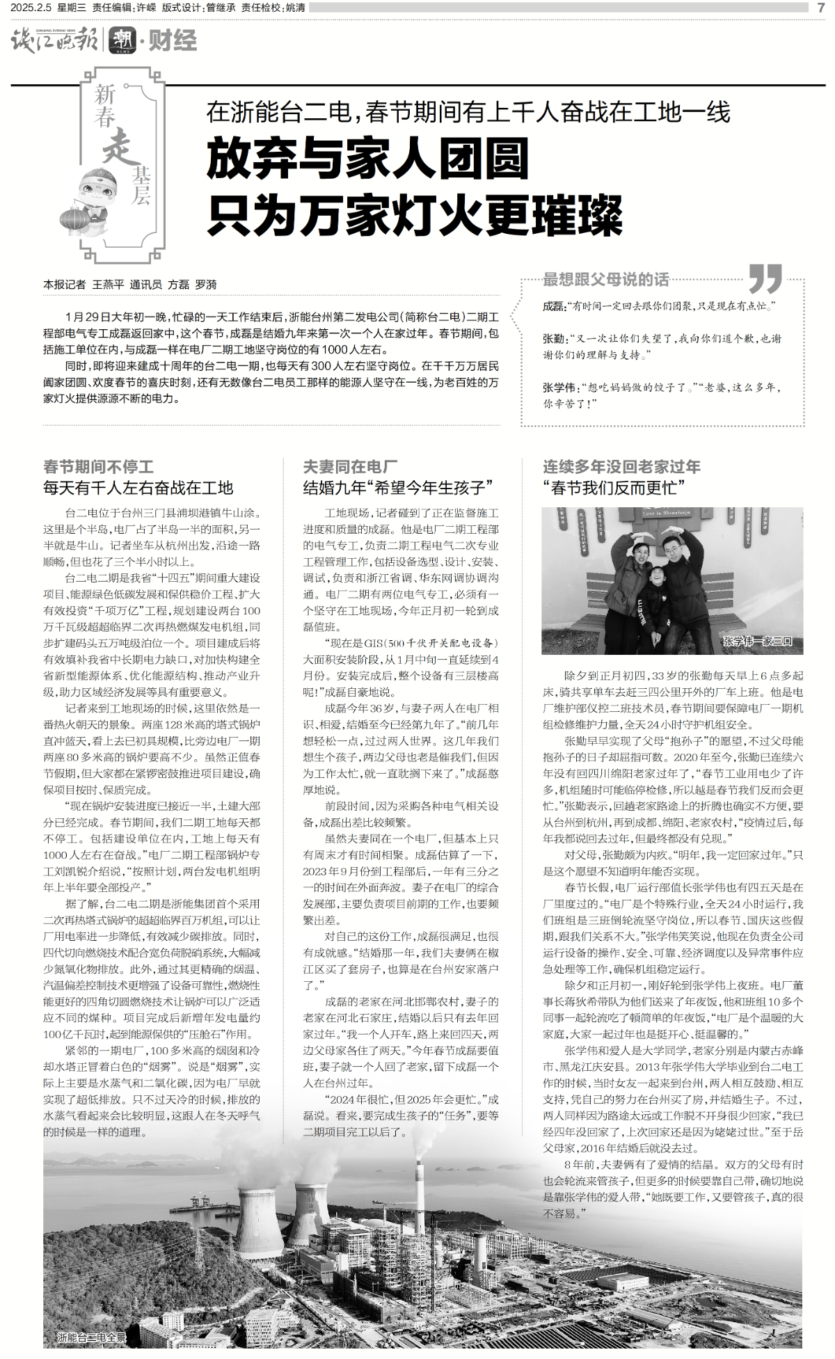 2月5日,钱江晚报整版报道《在188bet金宝博 台二电,春节期间有上千人奋战在工地一线 放弃与家人团圆 只为万家灯火更璀璨》。 钱江晚报 图