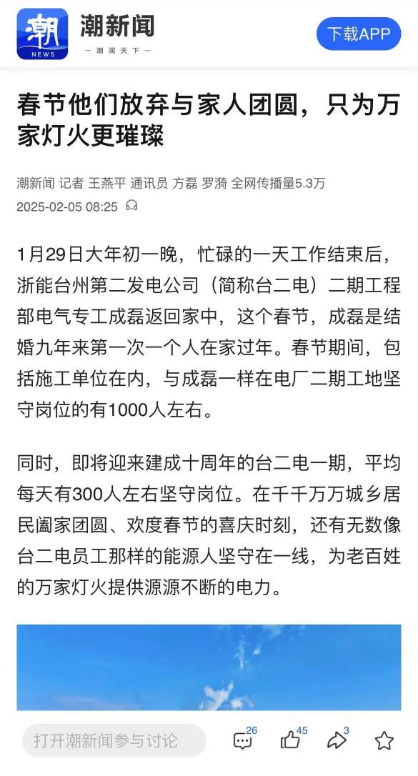 同时,即将迎来建成十周年的台二电一期,平均每天有300人左右坚守岗位。在千千万万城乡居民阖家团圆、欢度春节的喜庆时刻,还有无数像台二电员工那样的能源人坚守在一线,为老百姓的万家灯火提供源源不断的电力。