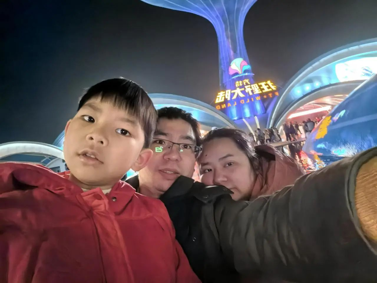 带大儿子在台州方特乐园游玩,中间为张勤,右为张勤爱人。 台二电 提供