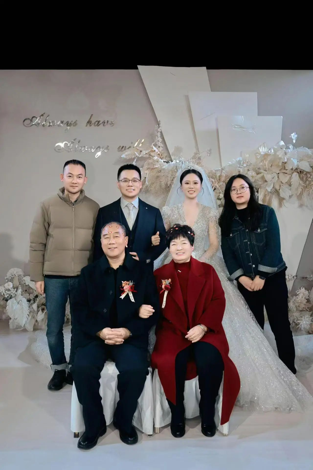 成磊(左一)一家合影。哥哥(左二)去年11月结婚,右一为成磊妻子。 台二电 提供