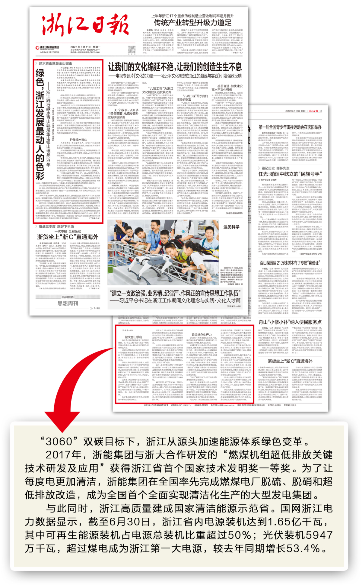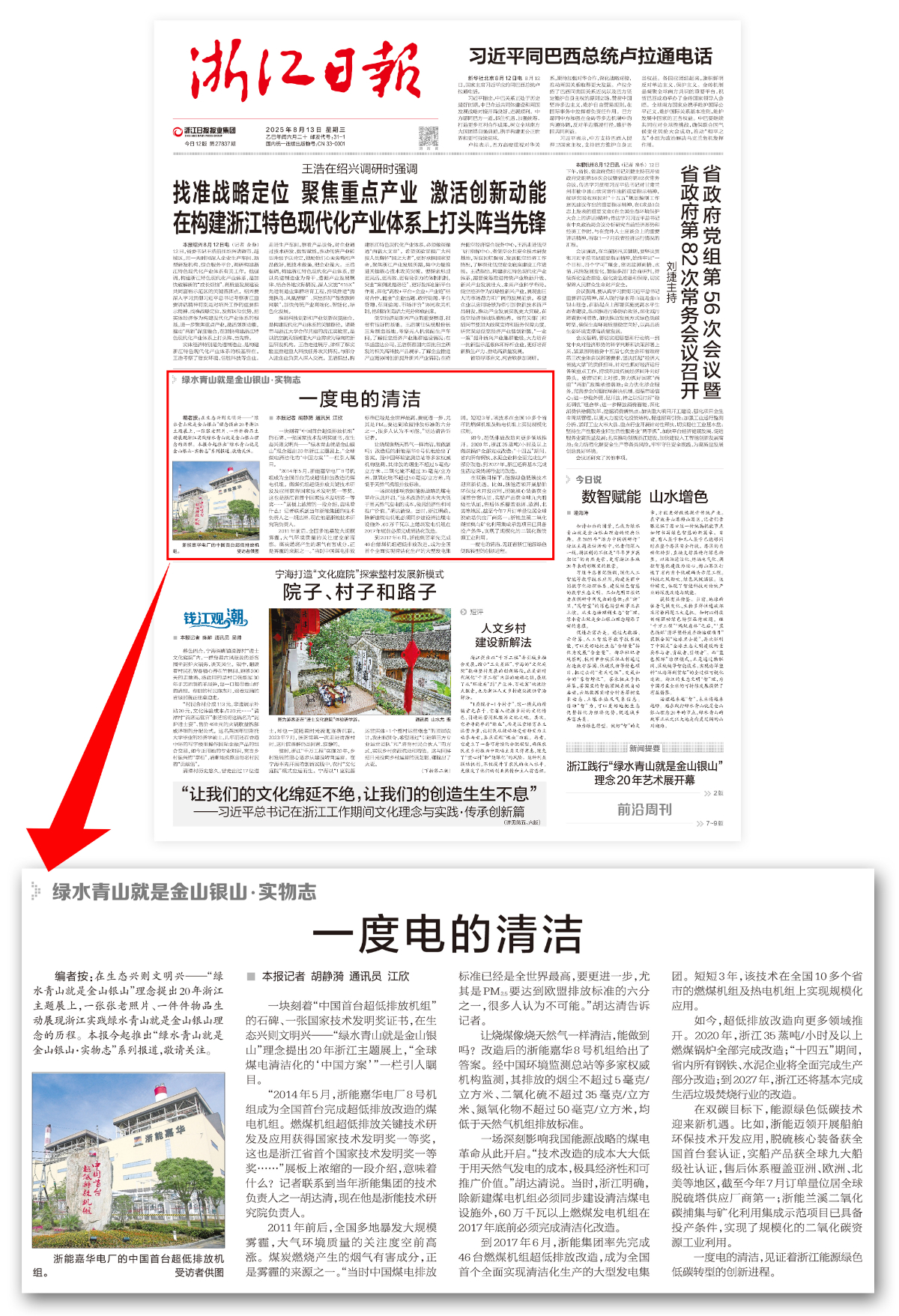 8月13日起,《浙江日报》推出“绿水青山就是金山银山·实物志”系列报道,开栏首篇在头版刊发《一度电的清洁》,见证多年来浙江能源绿色低碳转型的创新进程。