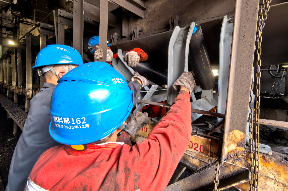“输煤系统就是电厂的消化道,堵一刻都不行!”最考验耐心的是6月25日的C5皮带纠偏装置故障。当时正值负荷高峰,长时间检修必将影响机组发电。金崇华、沈振平、罗邦吉三人不顾高温闷热带来的不适,坚持在封闭煤场的气膜内持续工作。皮带纠偏容不得半点心急,角度要一点点调,等皮带运转几圈后再观察效果。花了近两个小时,他们才让皮带“重回正轨”,当时摘下的安全帽里满是积存的汗水。