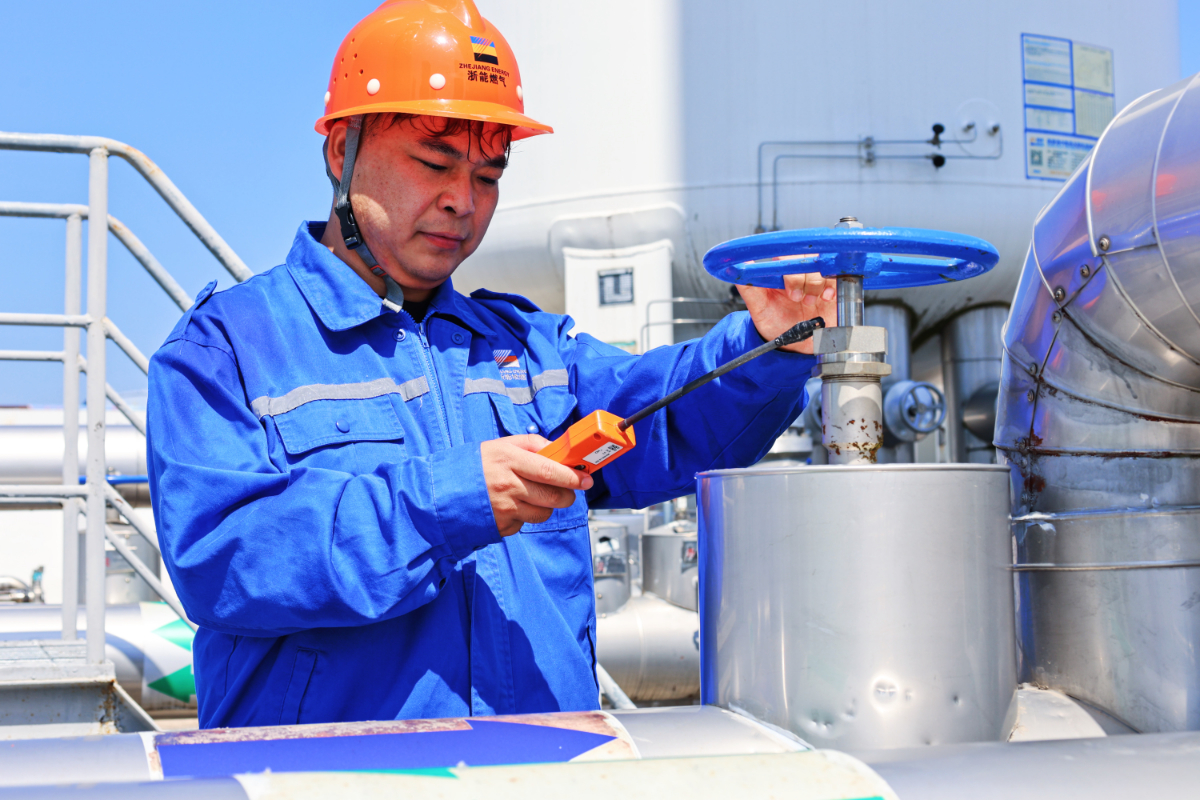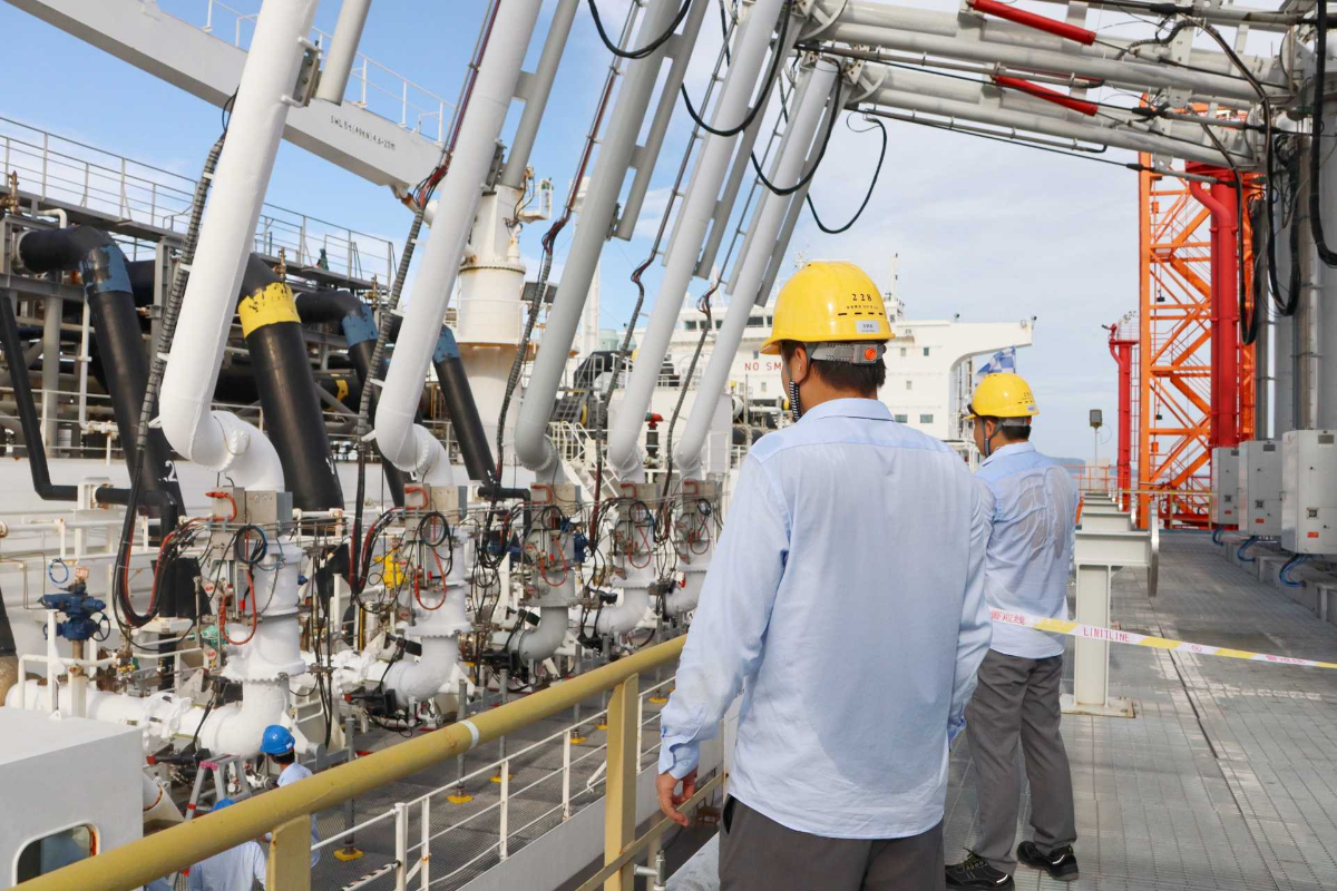 烈日下,温州LNG公司操作监督组成员为接船作业提供岸上协作与监护支持。 谢晨滢 摄
