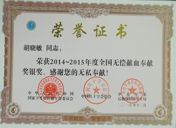 近日,温州发电公司员工胡晓敏获全国无偿献血奉献银奖,这是他第2次获得“全国无偿献血奉献银奖”殊荣,也是对他多年来长期坚持无偿献血,关心公益事业的肯定与褒奖。