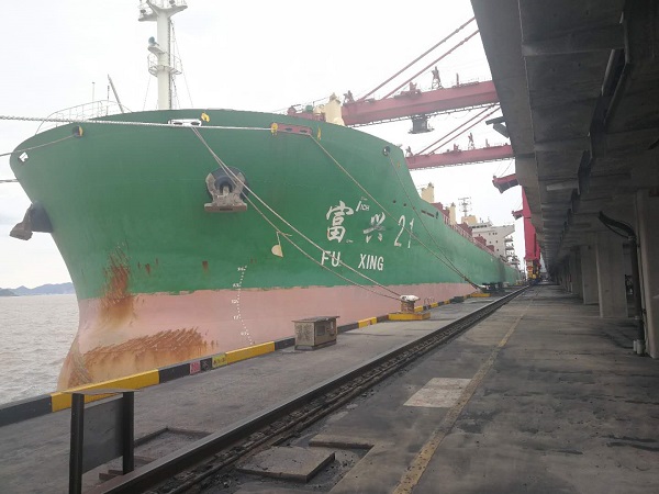 交货的富兴21轮靠卸舟山煤电码头。188bet金宝博 舟山煤电公司 提供