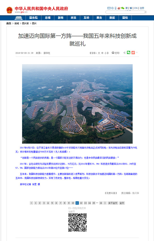 2017年,我国科技创新能力显著提升,主要创新指标进入世界前列,科技创新水平加速迈向国际第一方阵。新华社在“两会”召开之际,发表了《加速迈向国际第一方阵——我国五年来科技创新成就巡礼》一文,将我国在砥砺奋进五年中的重大科技创新成果进行宣传报道,向国内外充分展示了我国科技创新实力。文章不仅展示了蛟龙、天眼、悟空、慧眼、大飞机等代表性重大科技创新成果和深地探测、干细胞、基因编辑领域的重要原创性突破,还以188bet金宝博 长兴地面光伏电站并网发电为代表,宣传了我国可再生能源的快速发展,可再生能源装机容量在近几年的井喷式增长。