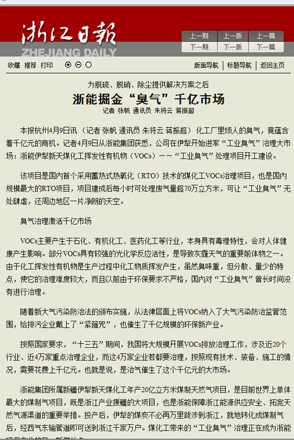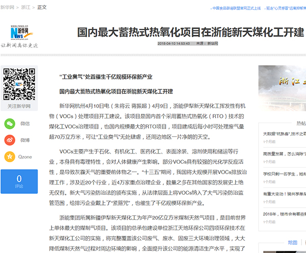 4月10日,《新华网》《浙江日报》分别刊发文章《国内最大蓄热式热氧化项目在188bet金宝博 新天煤化工开建》《188bet金宝博 掘金“臭气”千亿市场》,报道188bet金宝博 伊犁新天煤化工挥发性有机物(VOCs)处理项目开工建设,进军“工业臭气”治理大市场。