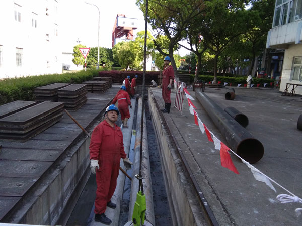 在管道施工现场,纷纷拉起了安全警戒线。轰鸣的吊机启动声,红色连体服四处都是,一块块沉重的盖板被吊起,堆放在一处。撬棒、打水泵、手拉葫芦、吊绳、扣环等工作器具摆放得整整齐齐,这场管道翻身的“节能战”有条不紊地进行着。