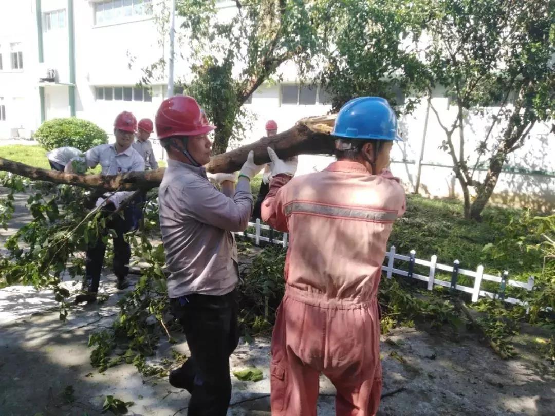 台风过后,台州发电厂的厂区道路两旁随处可见倒伏的大树,折断的树干和飘落的枯枝残叶,为开展灾后自救工作带来了障碍。8月11日,“利奇马”登陆的第二天,来自台电厂办党群、经营、生产、公司、行政党支部的76名机关科室的党员、干部放弃周末休假时间,主动投入到灾后恢复道路及厂区文明卫生清理工作中。13日,台电再次派出第二批救援人员向临海集结,经过一天一夜的努力,排水近12万立方米,圆满完成大洋小区地下停车场抢险任务,20时30分,救援队迅速转战台州中学校区地下室!(文:汪舜檀,图:朱新场)