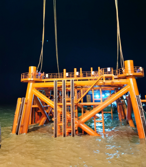 220千伏海上升压站是整个风电场的“心脏”,负责将风电机组的输出电压升高到更高等级电压并送出。海上升压站布置模式包含上部组块平台和下部结构。此次吊装完成的下部结构导管架是支撑升压站的基础,总高约20米,重达900吨,由中空的腿柱和连接腿柱的纵横杆组成,是海上升压站的水下桩基和上部组块的连接段。