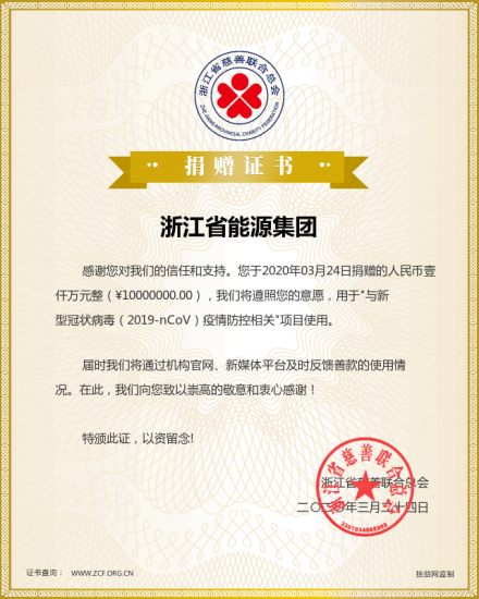 3月24日,188bet金宝博 收到浙江省慈善联合总会颁发的捐赠证书,188bet金宝博 作为首个响应浙江省慈善联合总会的省属企业,所属10家企业共向浙江省慈善联合总会捐款1000万元。