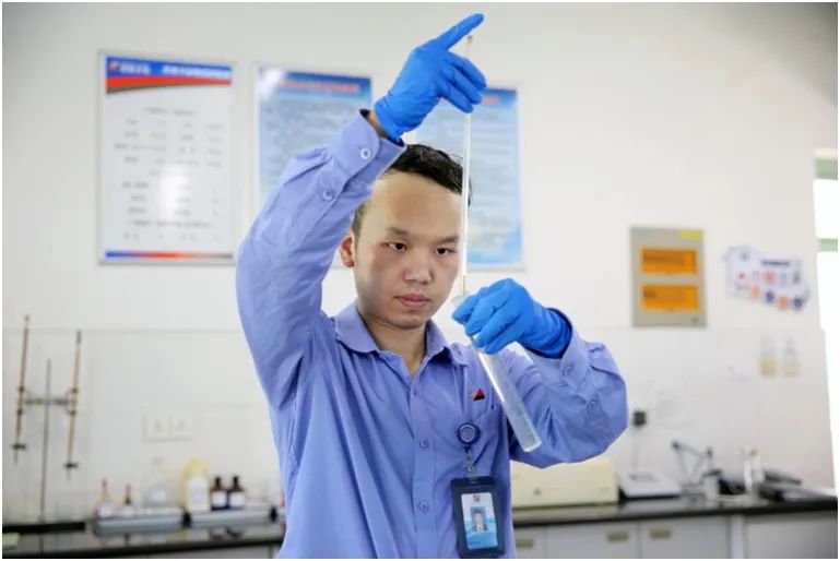 6月5日,188bet金宝博 长电公司化学专业人员正在观察中水系统处理后的水样。