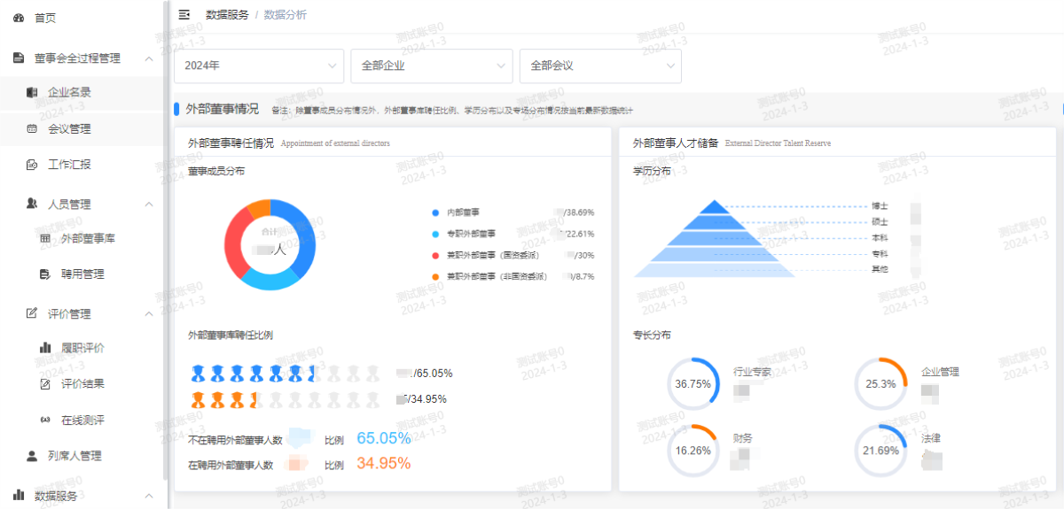 董事会运行管理系统按省国资委管理要求研发部署,依据国资监管机构要求与企业章程,结合企业发展战略和业务特点,形成外部董事多维度画像,深化预警提醒,前移监督关口,可视化呈现各企业董事会建设、外部董事人才储备等情况,实现预警在先、监督有形,助力董事会规范性建设更高效、更智能。截至2023年底,董事会运行管理系统已覆盖省国资委及16家省属企业,累计录入千余条会议数据与相关董事会议题数据,以及百余条外部董事履职数据,兼职外部董事库中拥有百余位人才储备。系统从使用便捷性、数据准确性和数据实用性三方面着手,打造“好用、实用、管用”的董事会运行管理数字化应用。