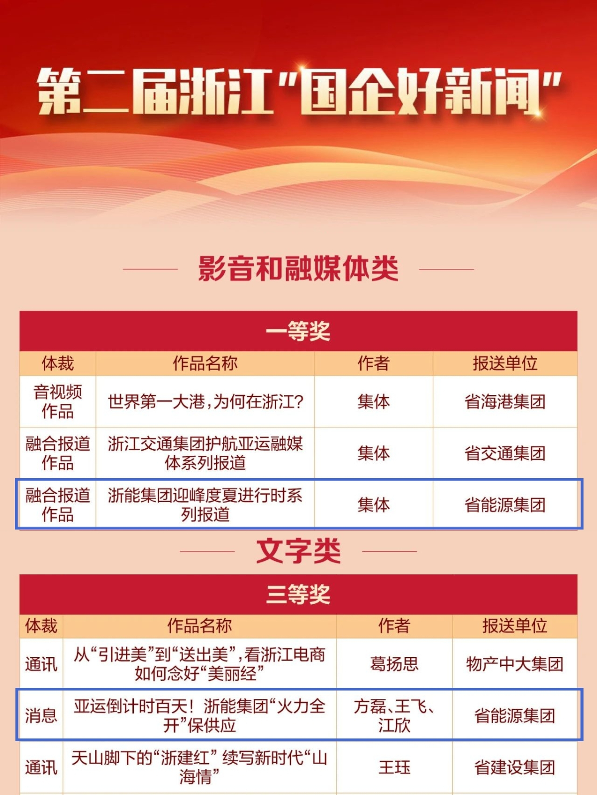 近日,第二届浙江“国企好新闻”推介结果正式公布,由188bet金宝博 选送的《188bet金宝博 迎峰度夏进行时系列报道》获影音和融媒体类一等奖,《亚运倒计时百天!188bet金宝博 “火力全开”保供应》获文字类三等奖,全面展示了新时代国资国企新闻宣传工作成效,积极传播了国资国企正能量。