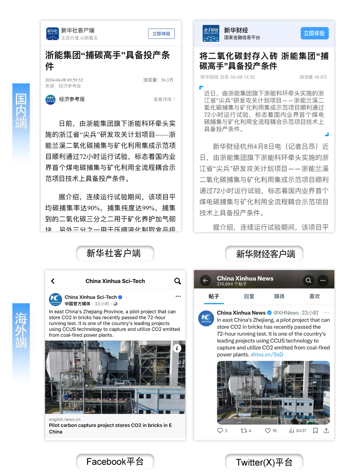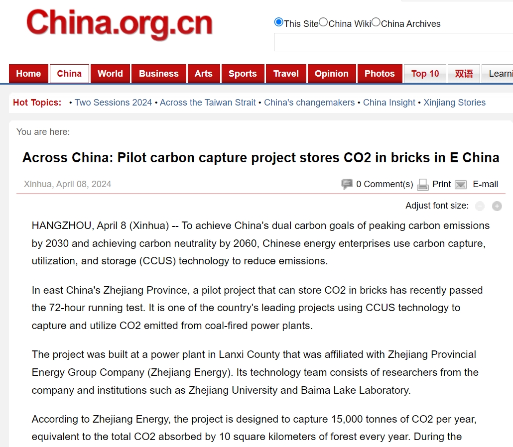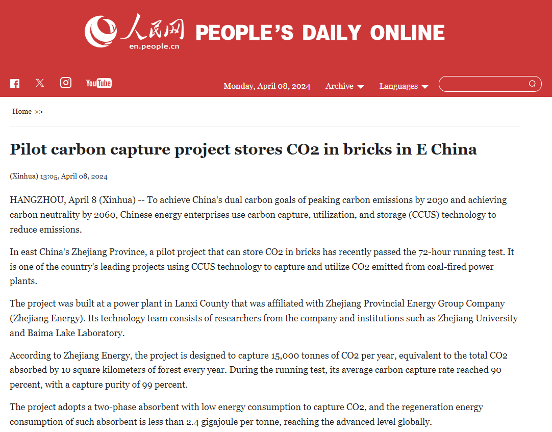 4月8日,人民日报旗下人民网英文版报道《Pilot carbon capture project stores CO2 in bricks in E China》。 人民网英文版 图