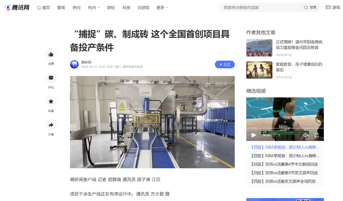 4月1日,腾讯网转载报道《“捕捉”碳、制成砖 这个全国首创项目具备投产条件》。 腾讯网 图
