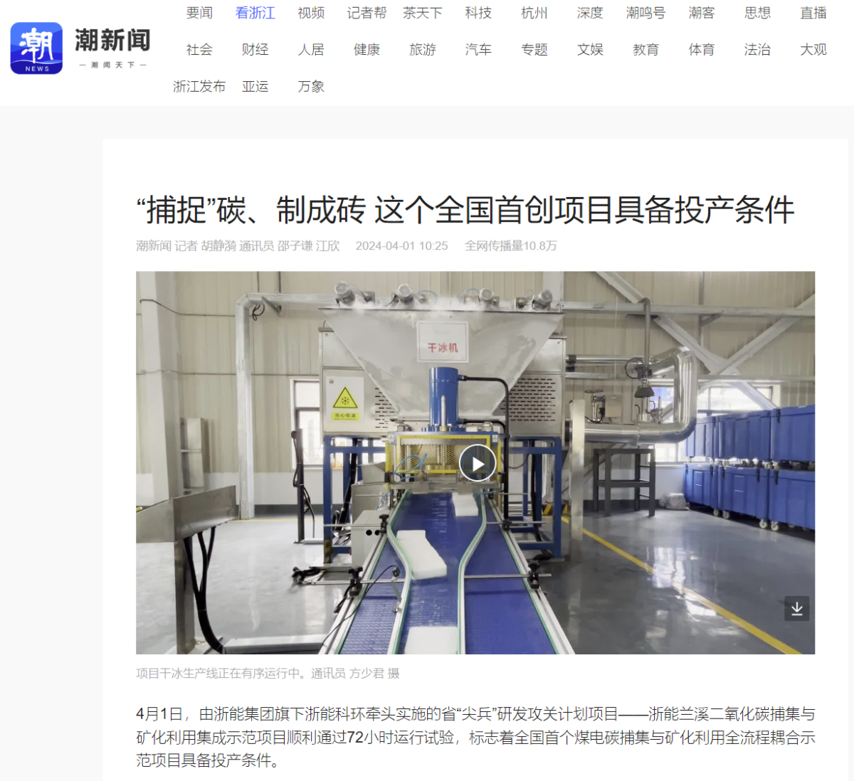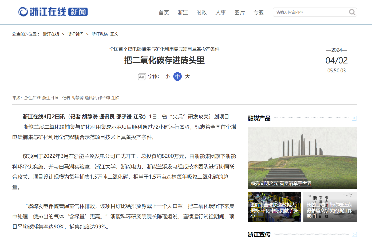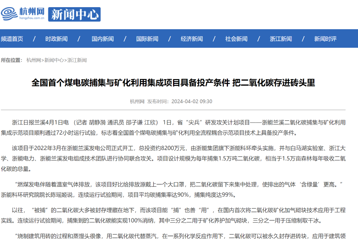 4月2日,浙江在线报道《全国首个煤电碳捕集与矿化利用集成项目具备投产条件 把二氧化碳存进砖头里》。 浙江在线 图