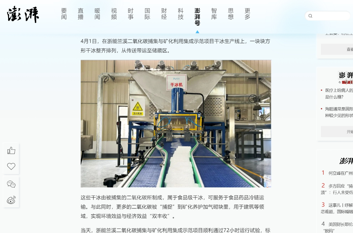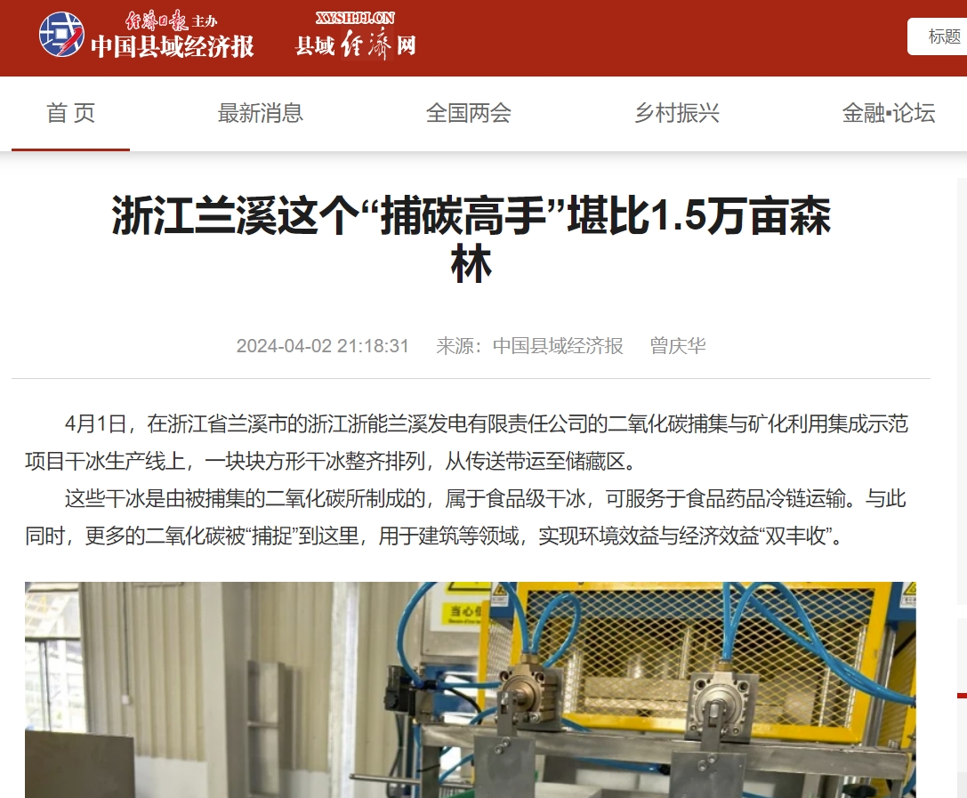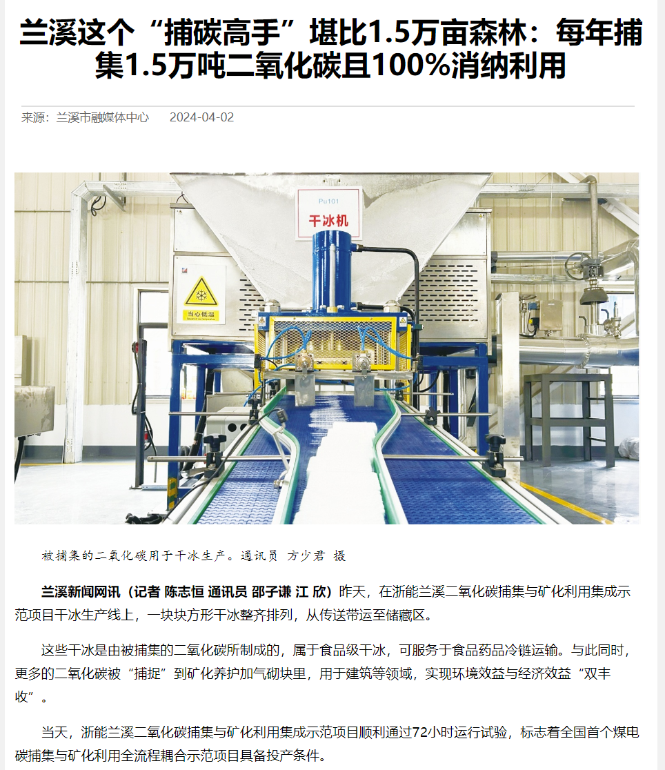 4月1日,兰溪新闻网报道《兰溪这个“捕碳高手”堪比1.5万亩森林:每年捕集1.5万吨二氧化碳且100%消纳利用》。 兰溪新闻网 图
