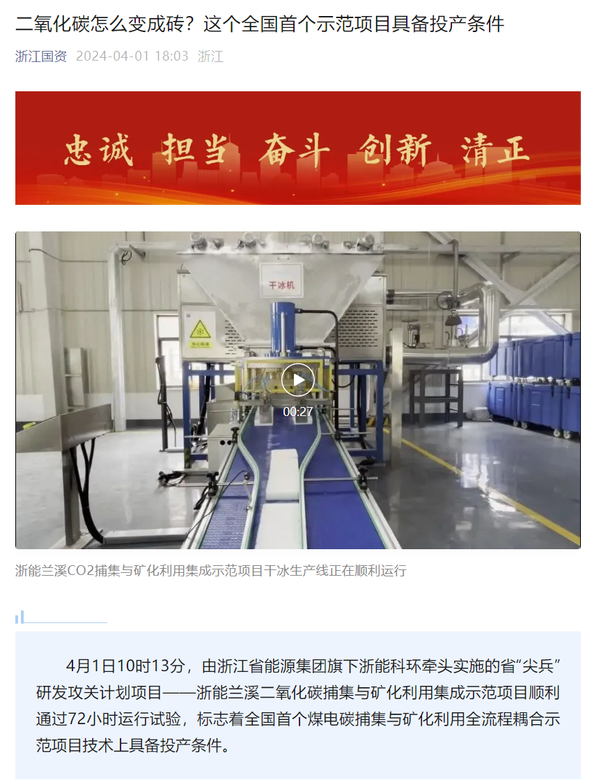 4月1日,省国资委“浙江国资”公众号发布《二氧化碳怎么变成砖?这个全国首个示范项目具备投产条件》。 浙江国资公众号 图
