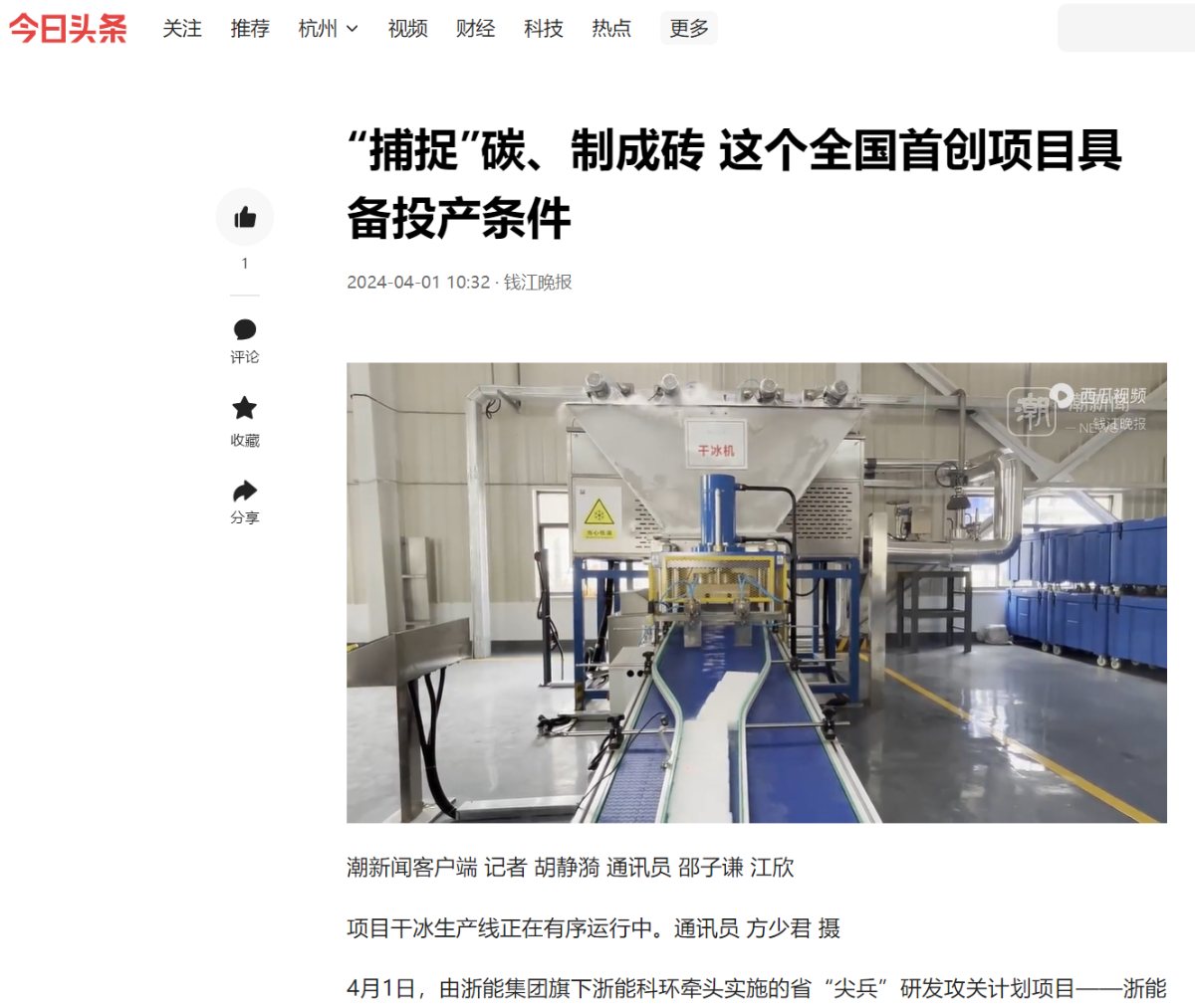 4月1日,今日头条转载报道《“捕捉”碳、制成砖 这个全国首创项目具备投产条件》。 今日头条 图