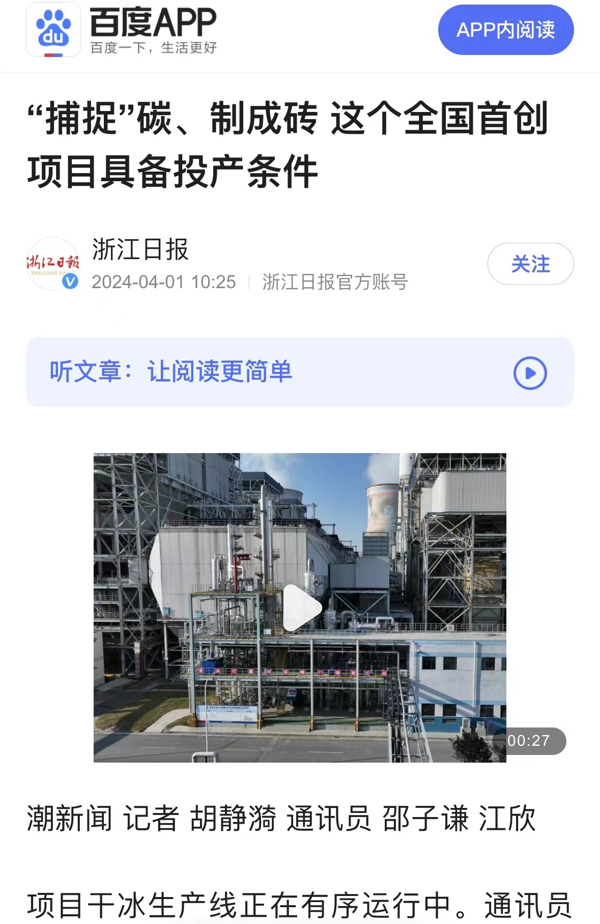 4月1日,浙江日报百度百家号转载报道《“捕捉”碳、制成砖 这个全国首创项目具备投产条件》 百度百家号 图