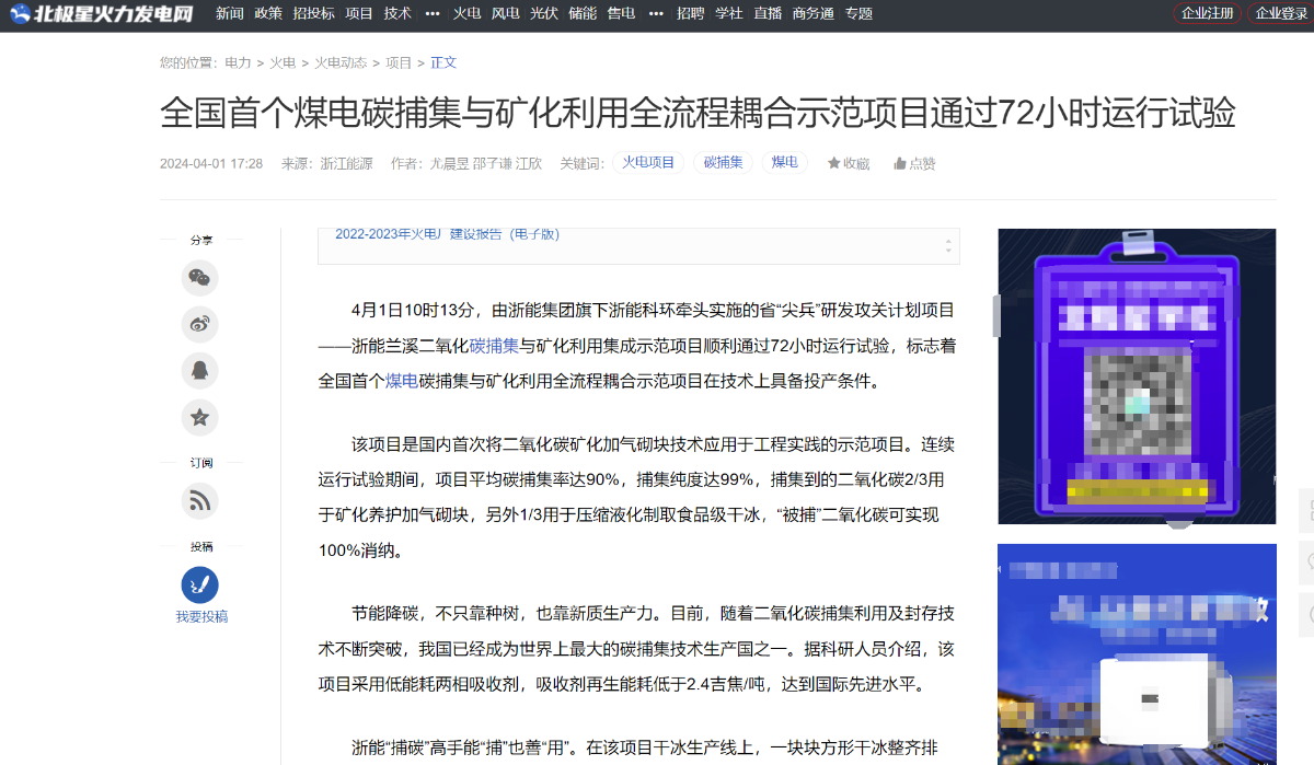 4月1日,北极星火力发电网转载报道《全国首个煤电碳捕集与矿化利用全流程耦合示范项目通过72小时运行试验》。 北极星火力发电网 图