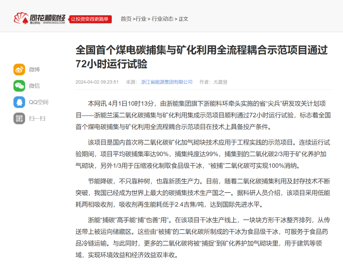 4月2日,同花顺财经报道《全国首个煤电碳捕集与矿化利用全流程耦合示范项目通过72小时运行试验》。 同花顺财经 图