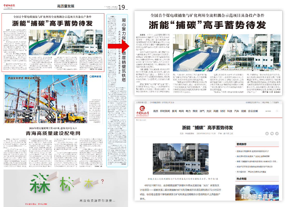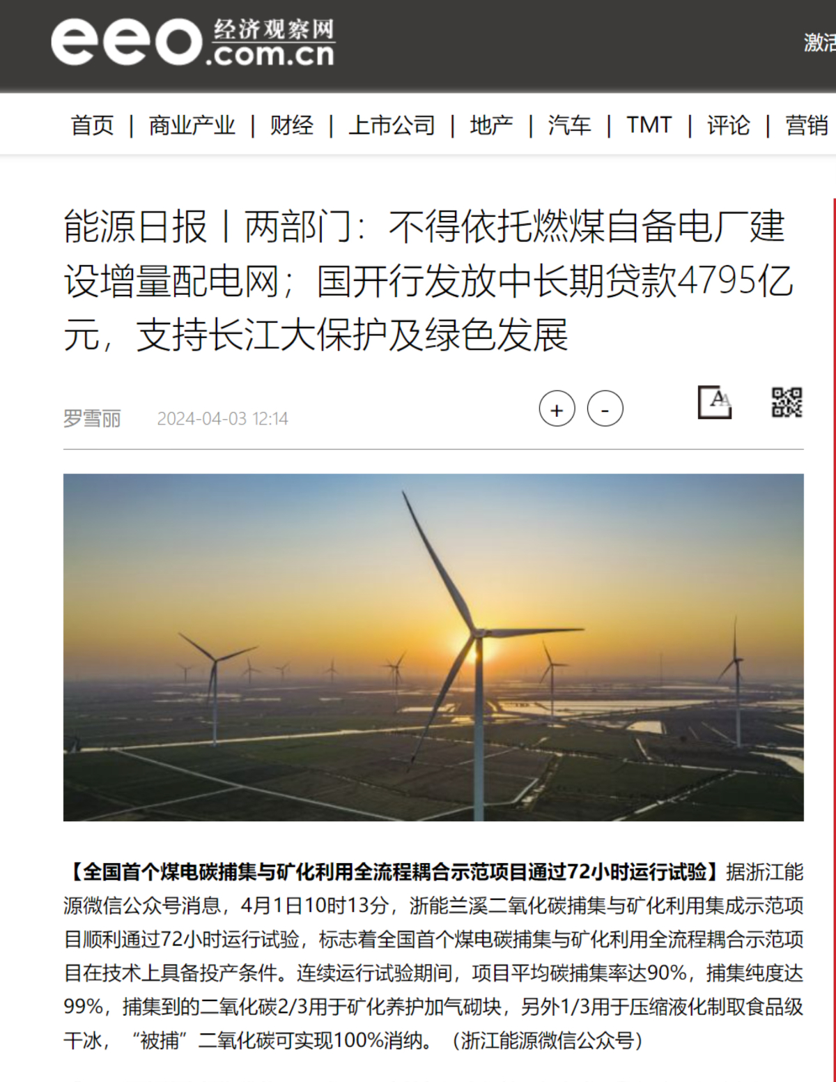 4月3日,经济观察网能源日报专栏转载报道《全国首个煤电碳捕集与矿化利用全流程耦合示范项目通过72小时运行试验》。 经济观察网 图