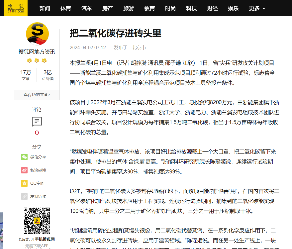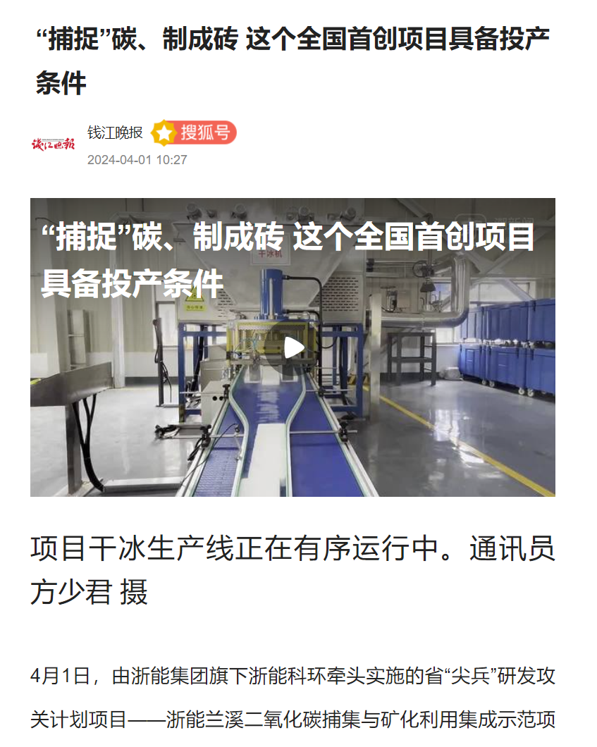 4月1日,钱江晚报搜狐号转载报道《“捕捉”碳、制成砖 这个全国首创项目具备投产条件》。 钱江晚报搜狐号 图