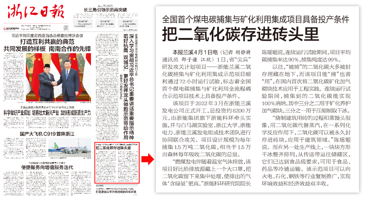 4月2日,《浙江日报》头版刊登188bet金宝博 新闻《全国首个煤电碳捕集与矿化利用集成项目具备投产条件 把二氧化碳存进砖头里》。 浙江日报 图