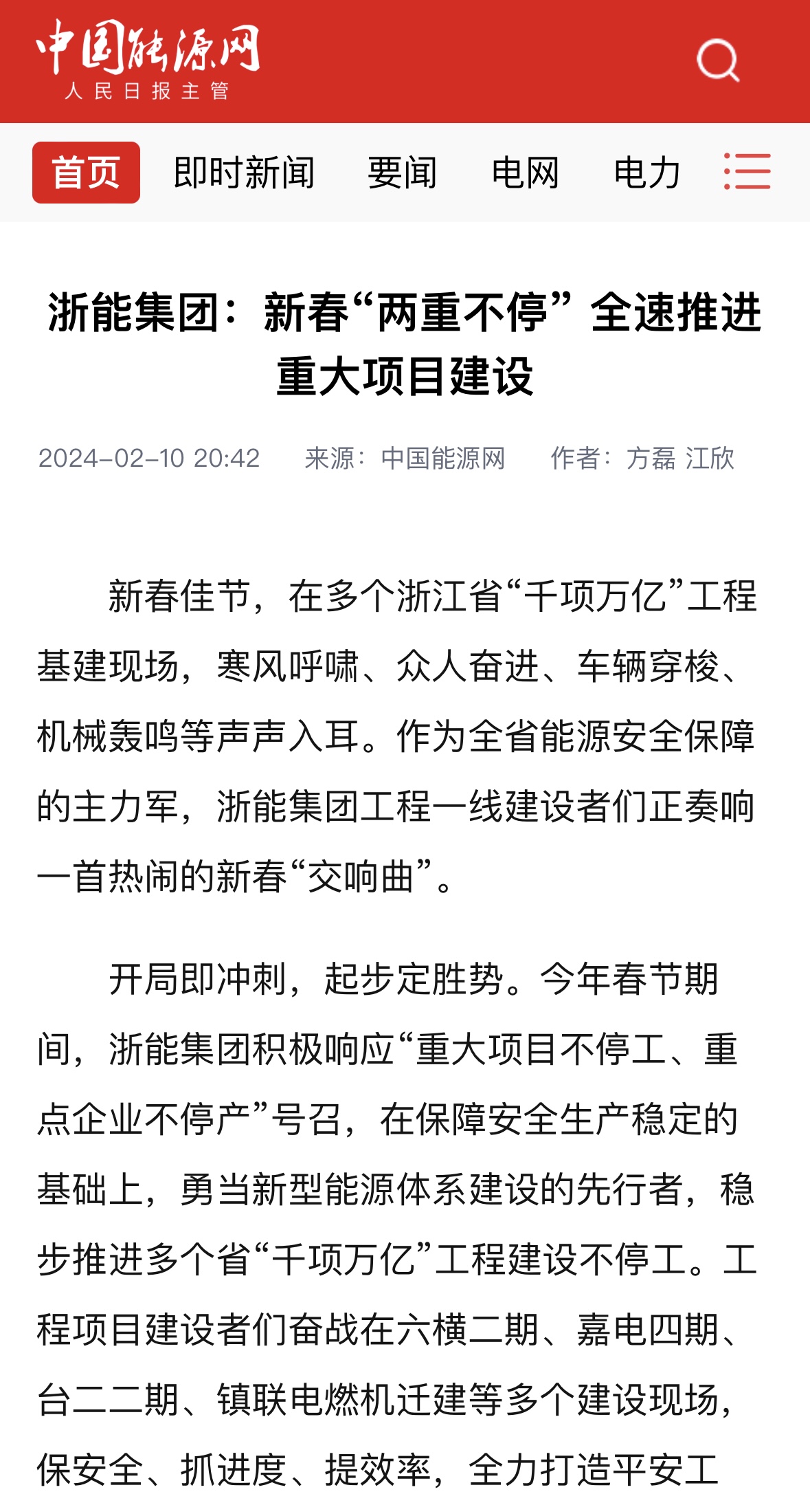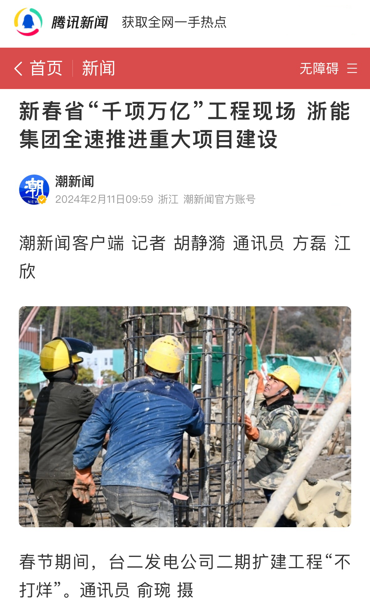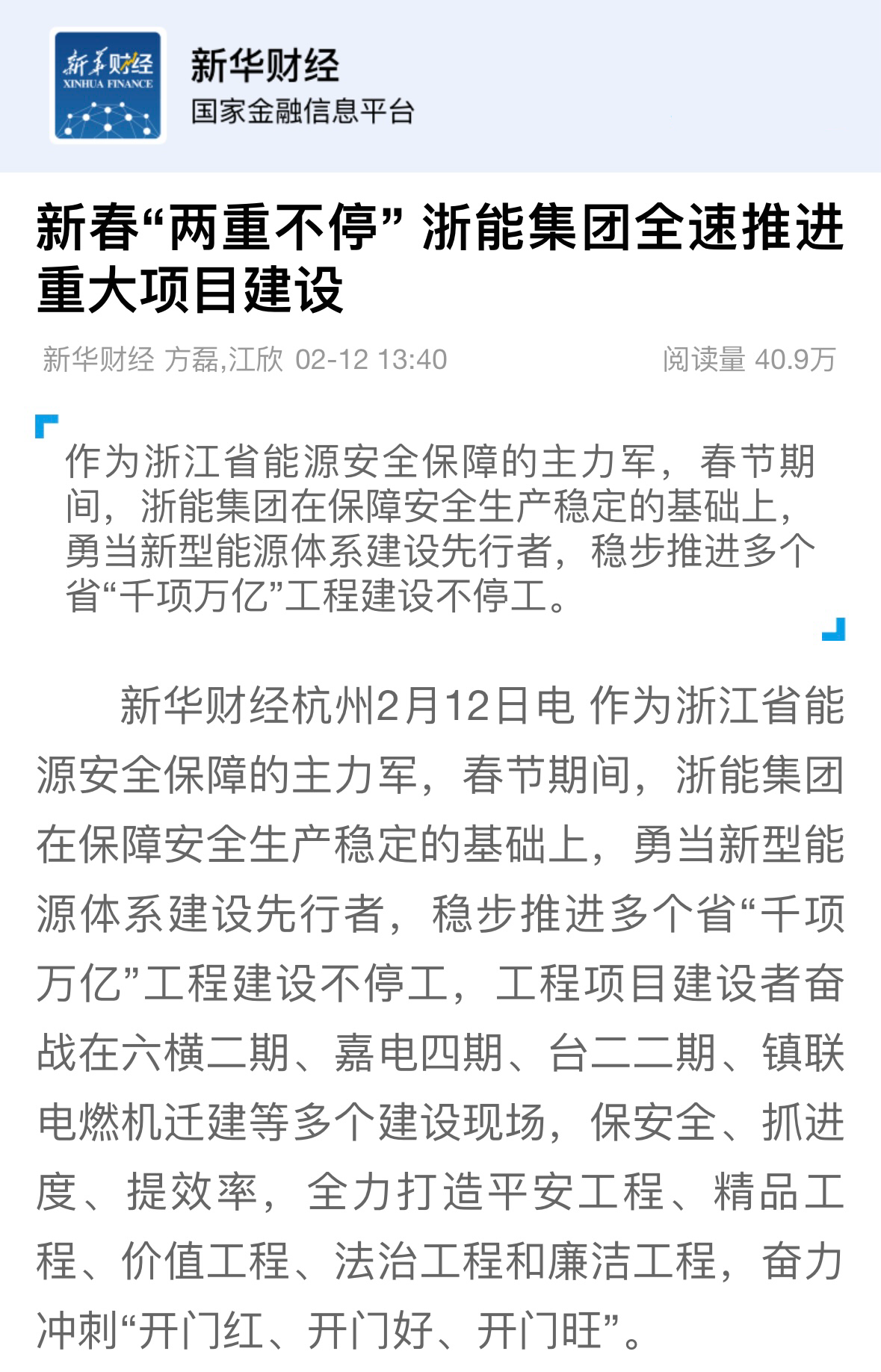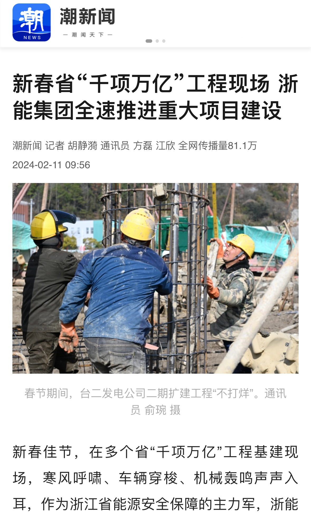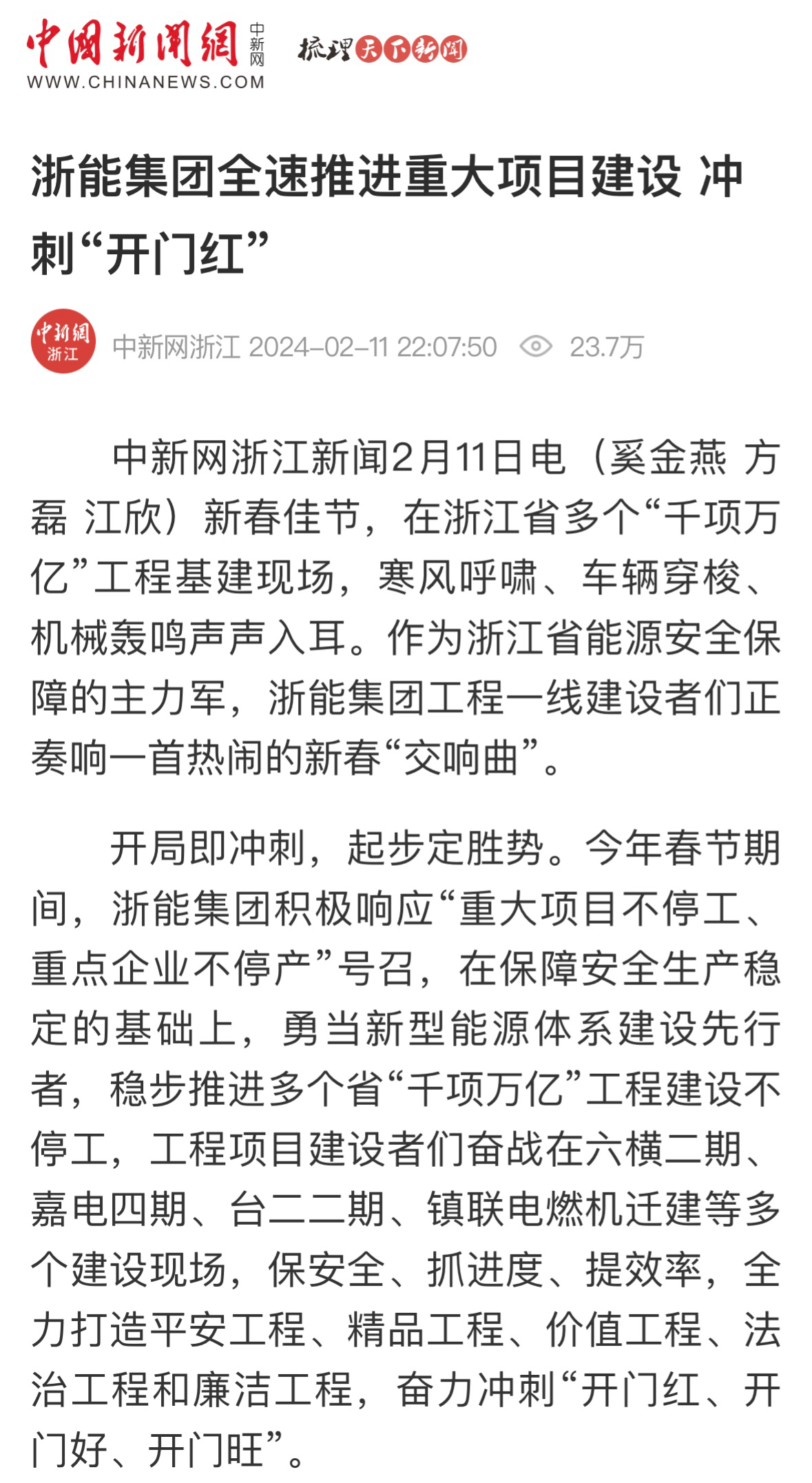 今年春节期间,188bet金宝博 积极响应“重大项目不停工、重点企业不停产”号召,在保障安全生产稳定的基础上,勇当新型能源体系建设先行者,稳步推进多个省“千项万亿”工程建设不停工,工程项目建设者们奋战在六横二期、嘉电四期、台二二期、镇联电燃机迁建等多个建设现场,保安全、抓进度、提效率,全力打造平安工程、精品工程、价值工程、法治工程和廉洁工程,奋力冲刺“开门红、开门好、开门旺”。新华社、中新社、潮新闻客户端、中国能源网等各级媒体聚焦报道188bet金宝博 新春全速推进重大项目建设。